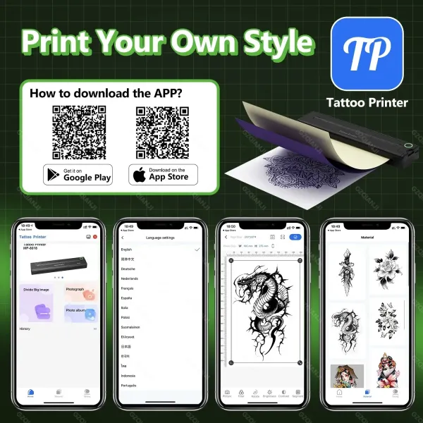 Для цього термопринтера підходить трансферний папір усіх виробників. Щоб перенести ескіз на шкіру, достатньо придбати тату-принтер, встановити застосунок, вставити папір і вибрати зображення для друку.