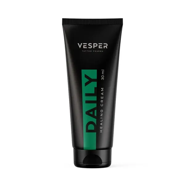 Специальная формула для ухода за татуировками на основе крема Vesper Healin Daily включает воду, масло кокоса раф., цетеариловый спирт, д-пантенол (7%), ПЭГ-40, соевый воск, кунжутное масло, растительный ланолин, глицерин, консервант, которые поглощают. кожей для увлажнения и заживления.